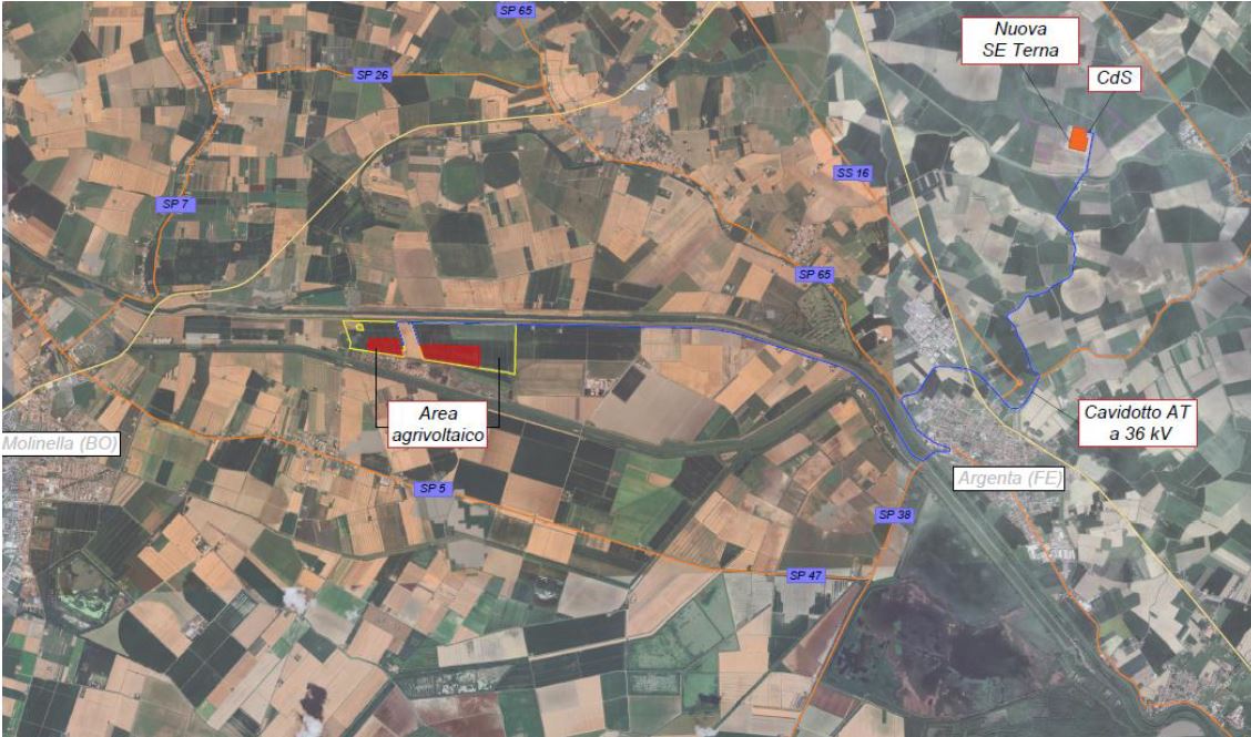 - Cavidotto in AT a 36 kV interrato per il collegamento dell’impianto agrivoltaico alla Nuova Stazione di Terna denominata “Portomaggiore” già autorizzata. La lunghezza del cavidotto è di circa 16,5 km che si svilupperanno lungo strade pubbliche carrabili passanti nei Comuni di Molinella (BO), Argenta (FE) e Portomaggiore (FE);